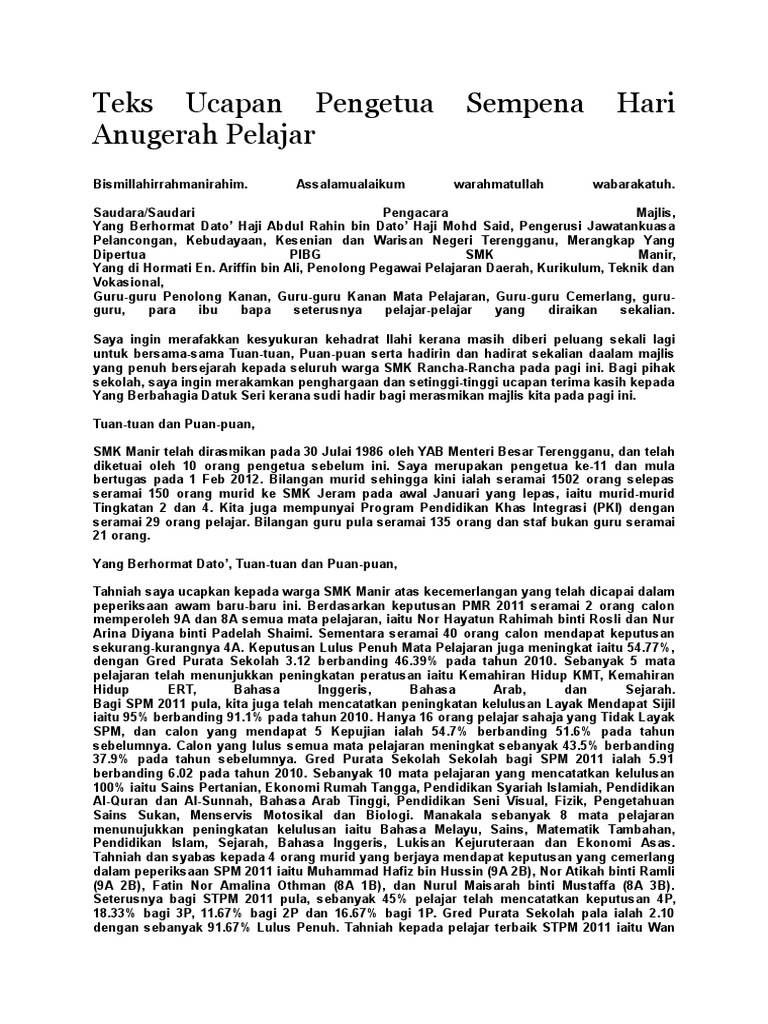 Teks Ucapan Pengetua Sempena Hari Anugerah Pelajar Pdf